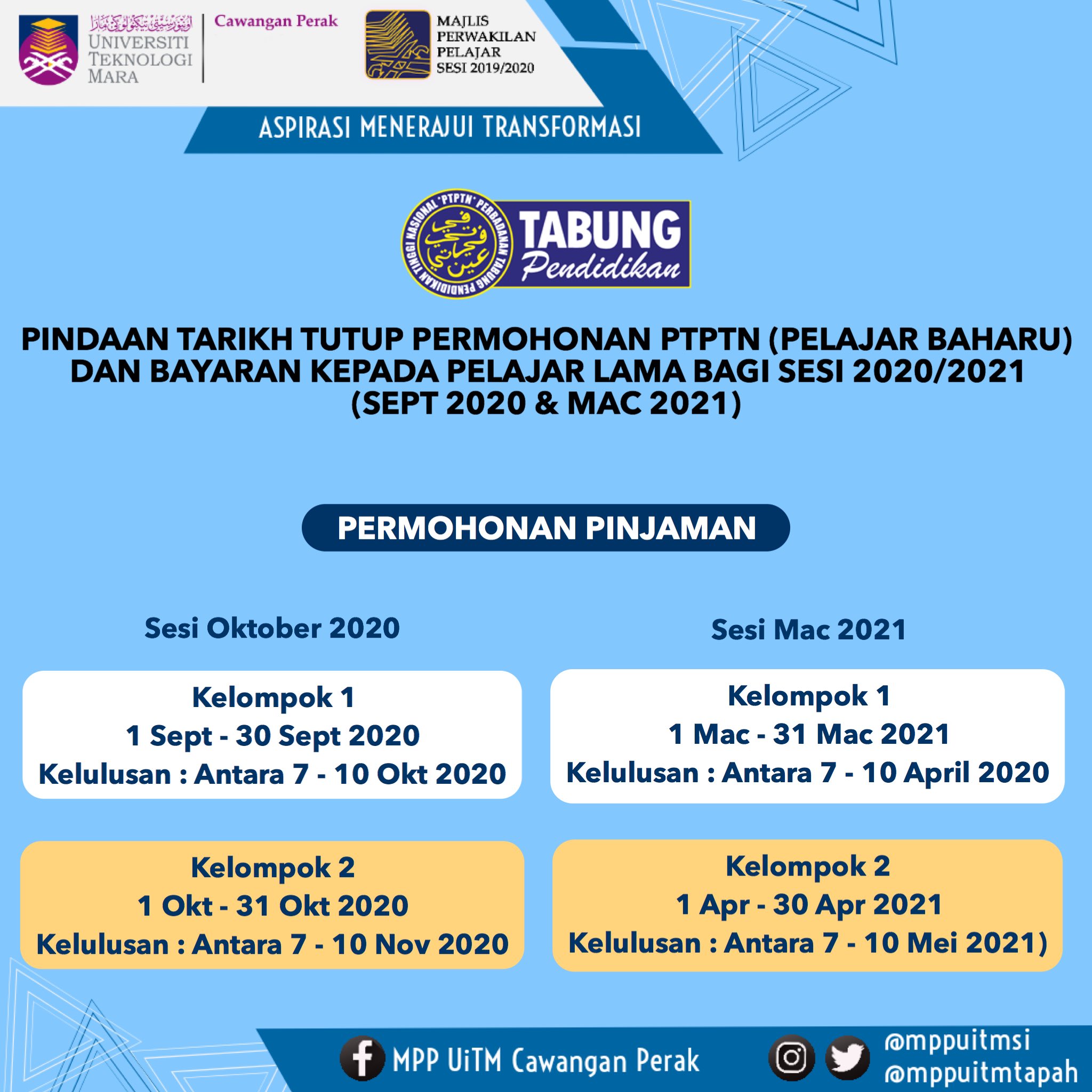 Mpp Uitm Cawangan Perak On Twitter Pindaan Tarikh Tutup Permohonan Ptptn Pelajar Baharu Amp Bayaran Kepada Pelajar Lama Bagi Sesi 2020 2021 Sept 2020 Amp Mac 2021 Uitmdihatiku Kitauitm Aspirasimenerajuitransformasi Uitmperak